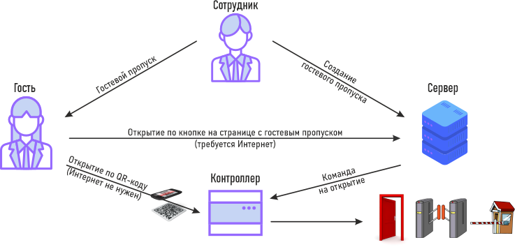 Но в этом случае к контроллеру должен быть подключён считыватель QR-кодов, и гость пройдёт на объект при помощи соответствующего QR-кода из полученного им гостевого пропуска.